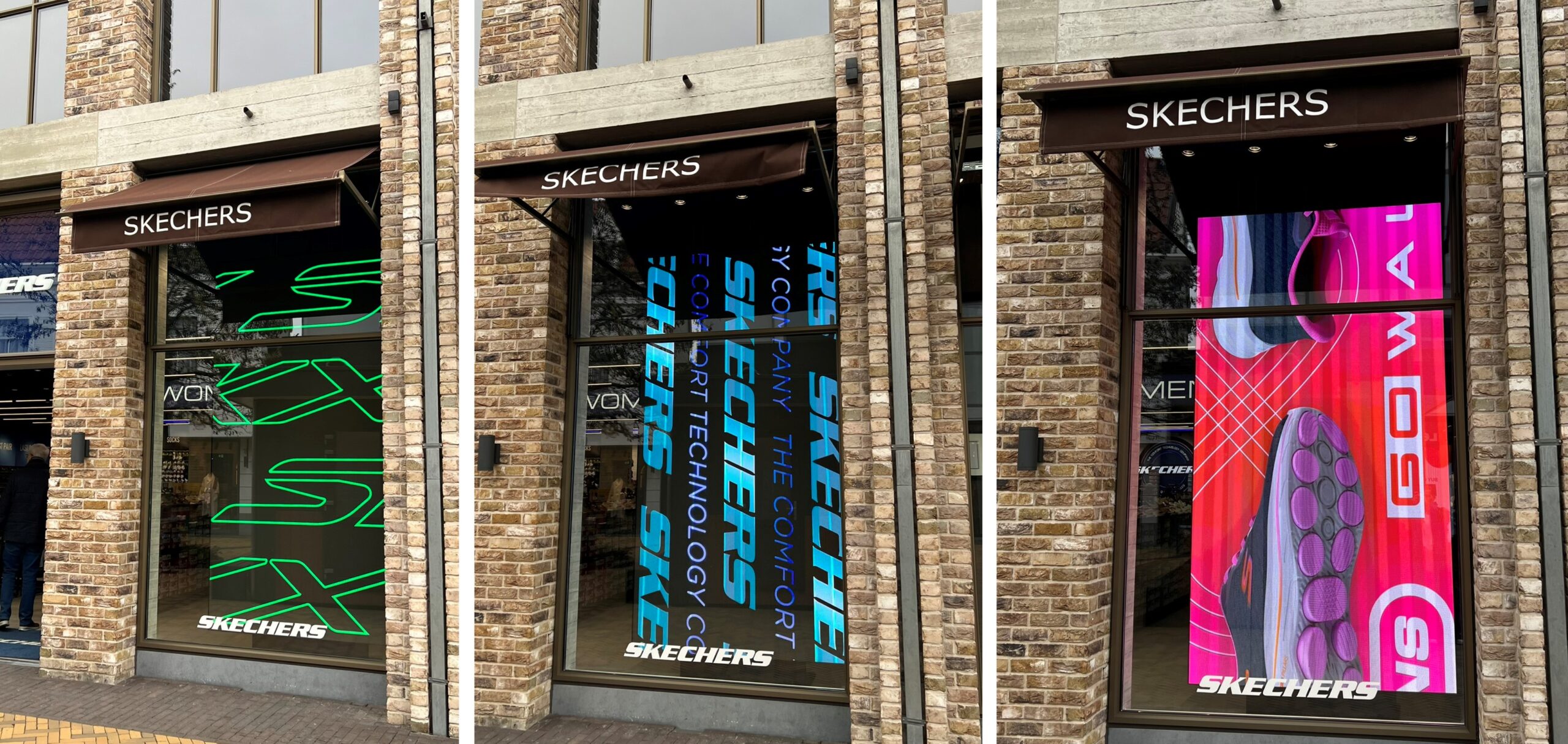 De LED-wall is door de bewegende content een speels contactmoment met het winkelend publiek. Skechers toont de nieuwe campagnes en trekt zelfs op meters afstand al de aandacht. De achterkant van de LED-wall is afgewerkt met een peesdoek zodat de campagne in de winkel op een rustigere manier voortgezet kan worden. Dit doek kan Skechers zelf eenvoudig wisselen. Zo is de campagne zowel via de narrowcasting-software in de etalge als via de peesdoeken aan de binnenkant volledig in eigen beheer van de winkel.